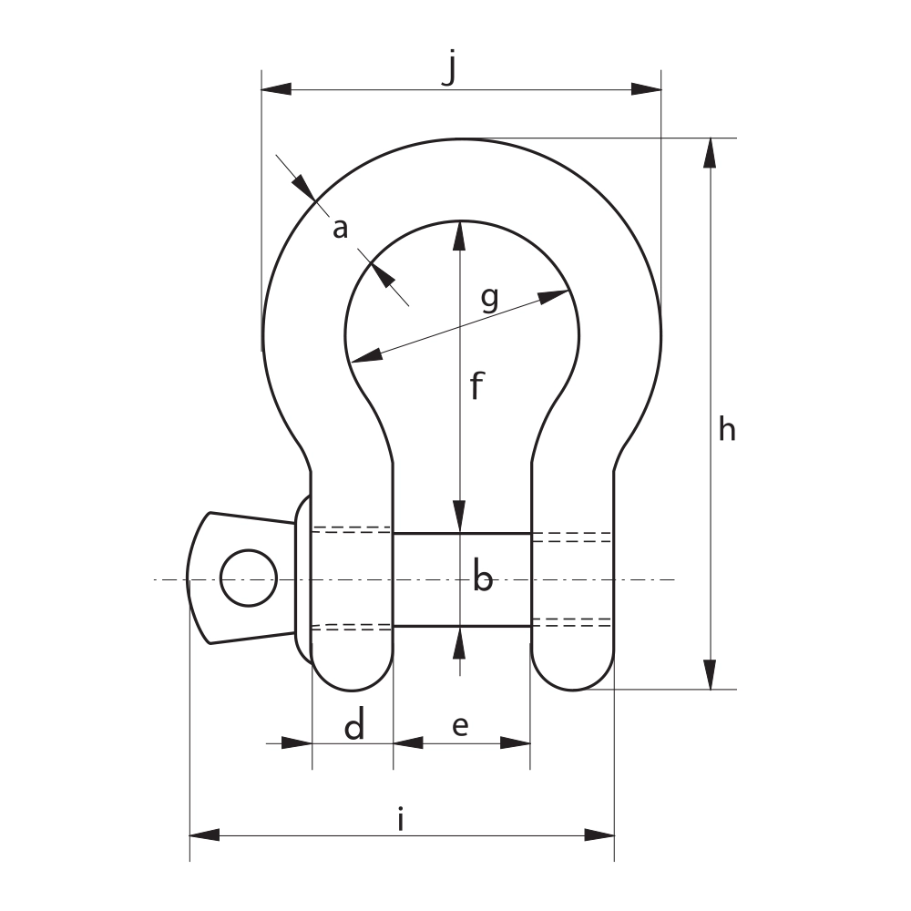 | Working Load Limit (t) | Diameter Bow a (mm) | Diameter Pin b (mm) | Diameter Eye c (mm) | With Eye d (mm) | Width Inside e (mm) | Length Inside f (mm) | Width Bow g (mm) | Length h (mm) | Length Bolt i (mm) | Width j (mm) | Thickness Nut k (mm) | Weight Each (kg) |
